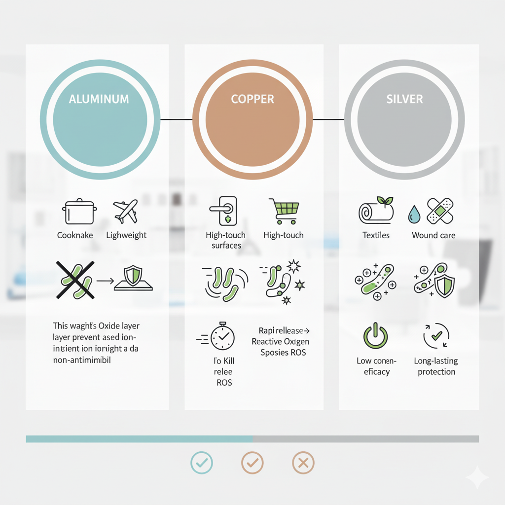 - Genel Antimikrobiyal Üstünlük: Yarış gümüş ve bakır arasındadır. Alüminyum bu yarışın bir parçası değildir.