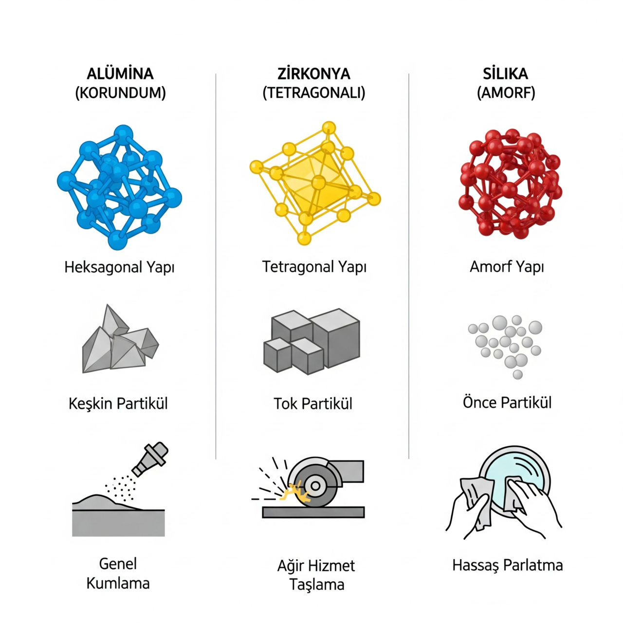 Aşındırıcı oksitler, yüzey hazırlamadan parlatmaya, kesmeden temizlemeye kadar sayısız endüstriyel uygulamada vazgeçilmez araçlardır. Alüminyum Oksit (Alümina), Zirkonyum Oksit (Zirkonya) ve Silisyum Dioksit (Silika) gibi yaygın kullanılan bu malzemelerin aşındırma performansı sadece kimyasal bileşimleriyle değil, aynı zamanda atomlarının uzayda nasıl düzenlendiğini belirleyen kristal yapılarıyla da derinden ilişkilidir. Farklı kristal yapılar, aşındırıcının sertliğini, tokluğunu, kırılganlığını ve dolayısıyla hedef yüzeyle etkileşim biçimini doğrudan etkileyerek elde edilen sonuçları dramatik bir şekilde değiştirebilir.