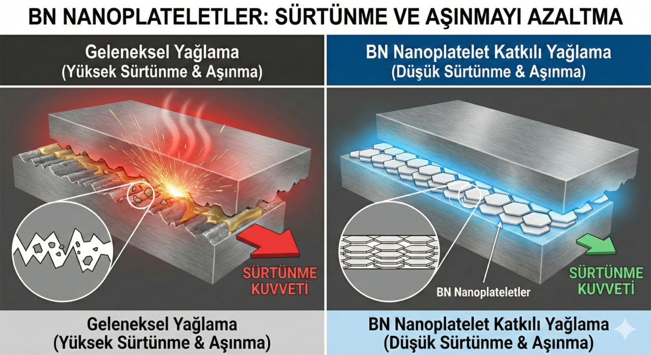3. Isı Kalkanı Oluşturma Sürtünme ısı yaratır, ısı da yağı bozar. BN Nanoplateletler, metaller gibi ısıyı çok iyi iletir. Oluşan sürtünme ısısını bölgesel olarak dağıtarak yağın yanmasını ve özelliğini kaybetmesini engeller.
