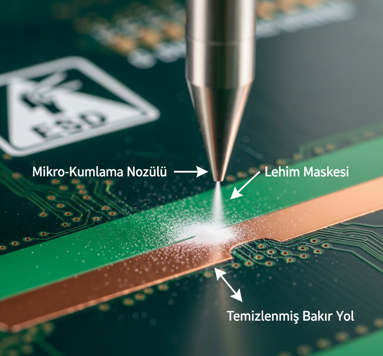 • ESD Güvenliği: En kritik konulardan biri Elektrostatik Deşarj (ESD) riskidir. Kuru tozların yüksek hızda püskürtülmesi statik elektrik birikmesine neden olabilir. Bu birikim aniden boşalırsa, kart üzerindeki hassas entegre devrelere anında ve kalıcı hasar verebilir. Bu nedenle, tüm mikro-kumlama sistemleri, nozülden toz toplama sistemine kadar tamamen ESD-güvenli (topraklanmış ve statik dağıtıcı malzemelerden yapılmış) olmak zorundadır.