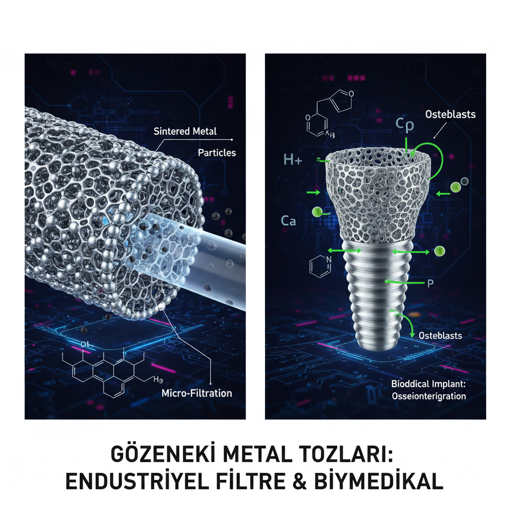 Klinik çalışmalarda, gözenekli titanyum tozlarından üretilen kalça ve diz implantlarının başarısı kanıtlanmıştır. Buradaki “filtre” mantığı tersten işler: Metalin içindeki gözenekler, kemik hücrelerinin (osteoblastların) metalin içine doğru büyümesine izin verir.