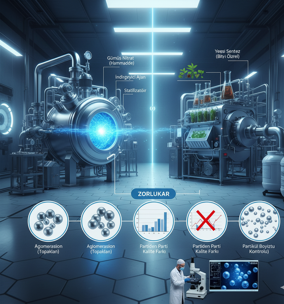 Endüstriyel ölçekte nano gümüş üretimi, basit bir kimyasal reaksiyondan çok daha fazlasıdır. Bu, partikül boyutunu nanometre hassasiyetinde kontrol etme, topaklanmayı engelleme ve on binlerce litrelik üretimde değişmez kaliteyi garanti etme sanatıdır. Sektörün “at gücü” olan kimyasal indirgeme metodu, maliyet etkinliği sunarken, sürdürülebilirlik arayışı “yeşil sentez” gibi yenilikçi yaklaşımları giderek daha önemli hale getirmektedir. Tüketici olarak gördüğümüz her antimikrobiyal ürünün arkasında, bu zorlu üretim süreçlerinin üstesinden gelen ciddi bir bilimsel ve mühendislik çabası yatmaktadır.