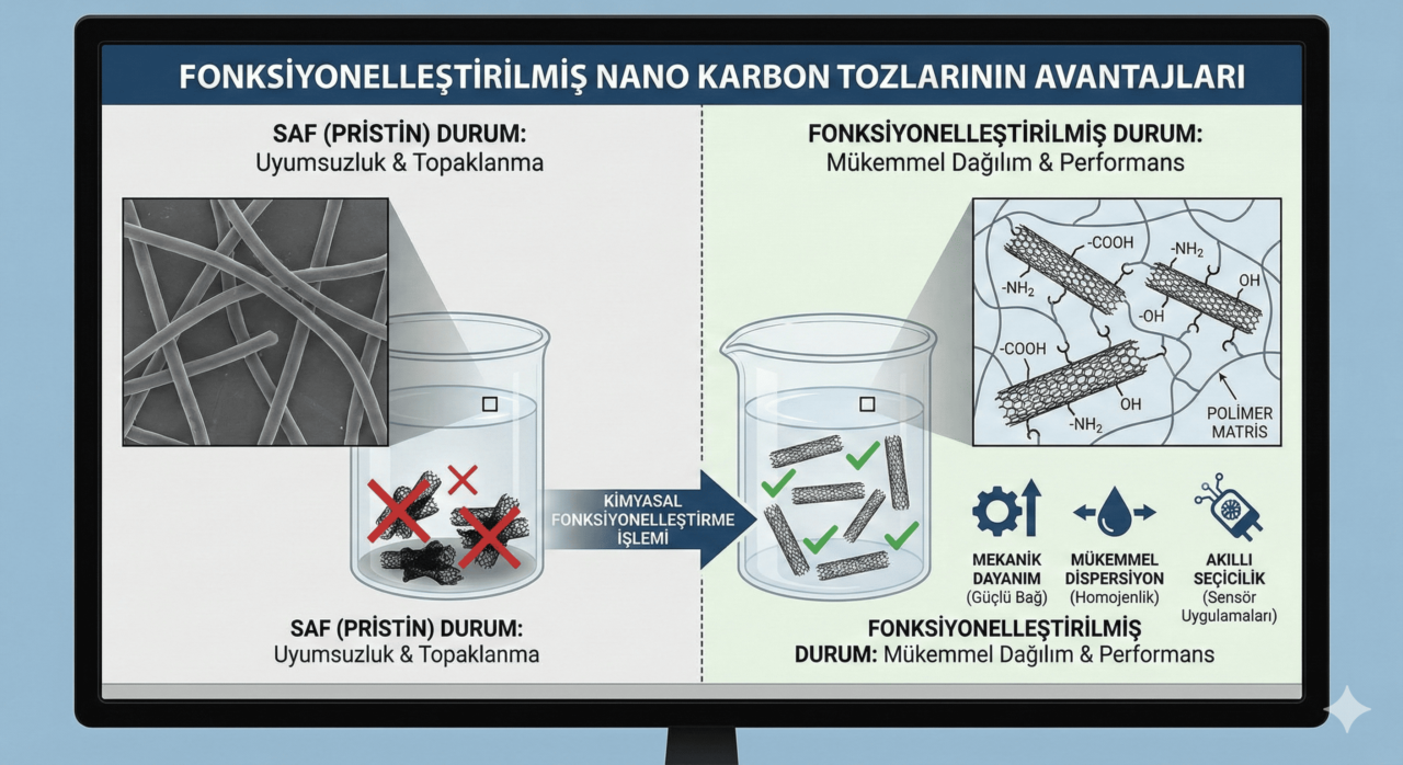 Fonksiyonelleştirme işlemi, bu pürüzsüz yüzeye kimyasal yöntemlerle moleküler “kancalar” (-COOH, -OH, -NH2 gibi gruplar) takma işlemidir. Bu kancalar sayesinde nano malzeme, içine girdiği sıvı veya plastikle el sıkışabilir, bağ kurabilir ve homojen bir şekilde dağılabilir.