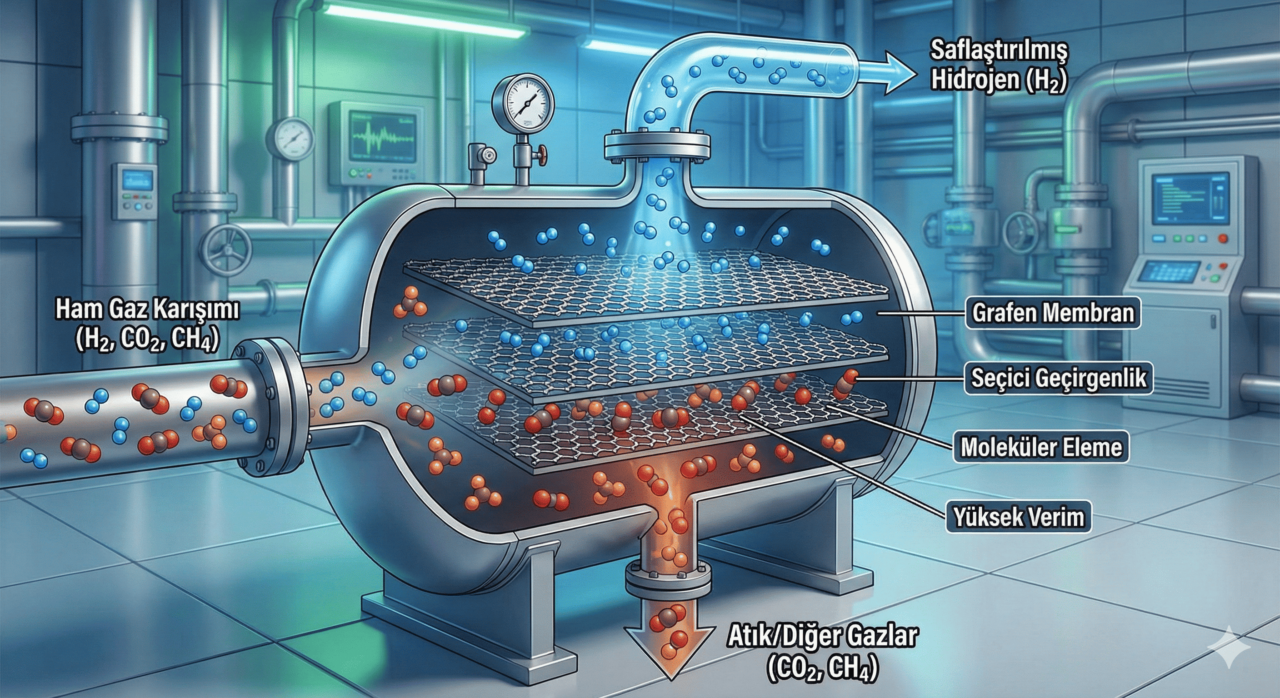 Hidrojen ekonomisinin en büyük engeli, üretim sonrası saflaştırma maliyetleridir. Grafen membranlar, $H_2/CO_2$ veya $H_2/N_2$ karışımlarında hidrojeni %99.9 saflıkta ve düşük enerjiyle ayırabilir. Bu, gri hidrojenden mavi hidrojene geçişte kritik bir rol oynar.
