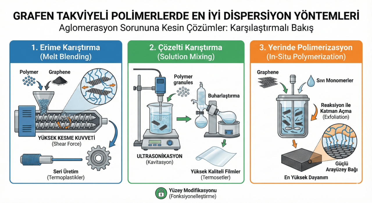 Grafen takviyeli kompozitlerde başarı, “ne kadar grafen koyduğunuzla” değil, “o grafeni nasıl dağıttığınızla” ölçülür. Doğru yöntem (Proses) ve doğru kimya (Fonksiyonelleştirme) birleştiğinde, plastikler metalle yarışır hale gelir.