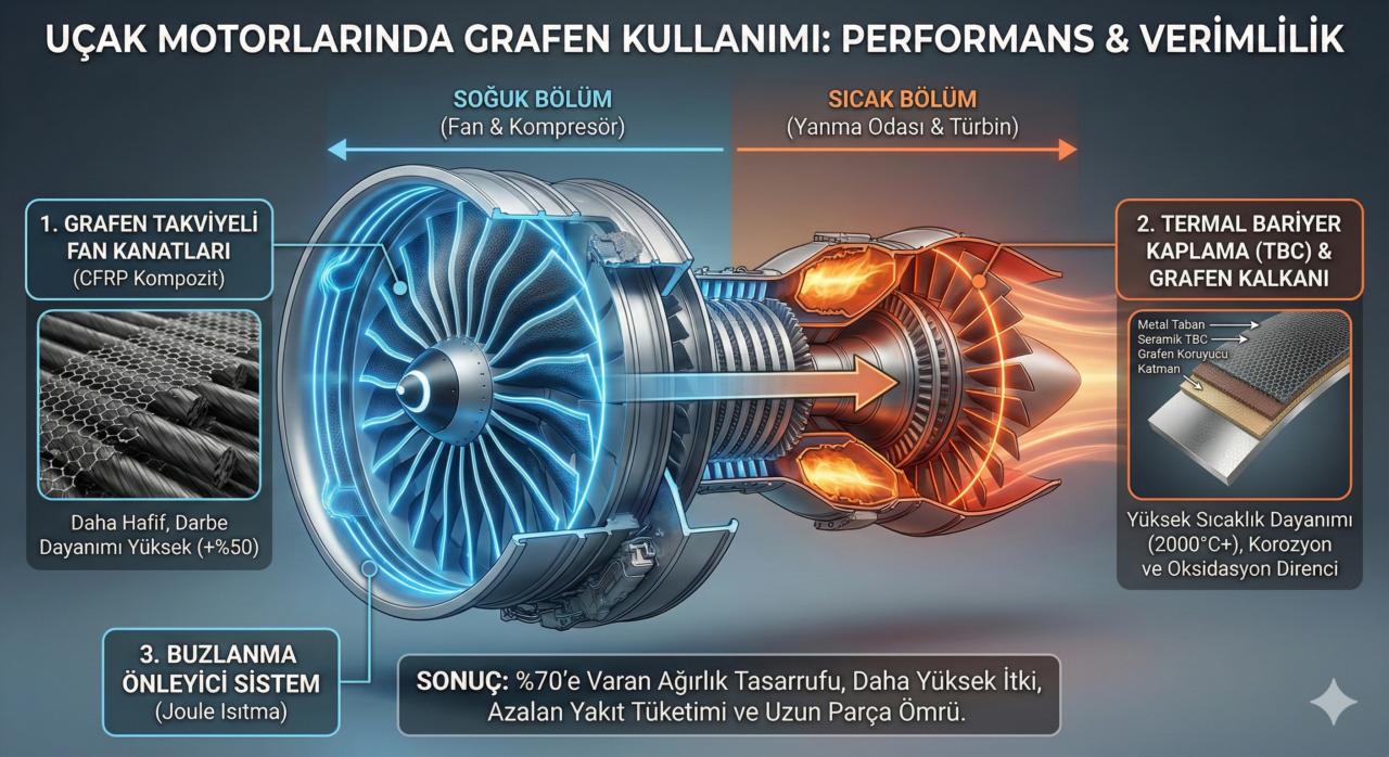 Ancak grafen, bu paradigmayı değiştiriyor. Hem “Soğuk Bölüm” (Fan ve Kompresör) hem de “Sıcak Bölüm” (Yanma Odası ve Türbin) için grafen, ağırlığı azaltırken mukavemeti artıran tek moleküler çözümdür. Peki, bu süper malzeme motorun tam olarak neresinde ve nasıl kullanılıyor?