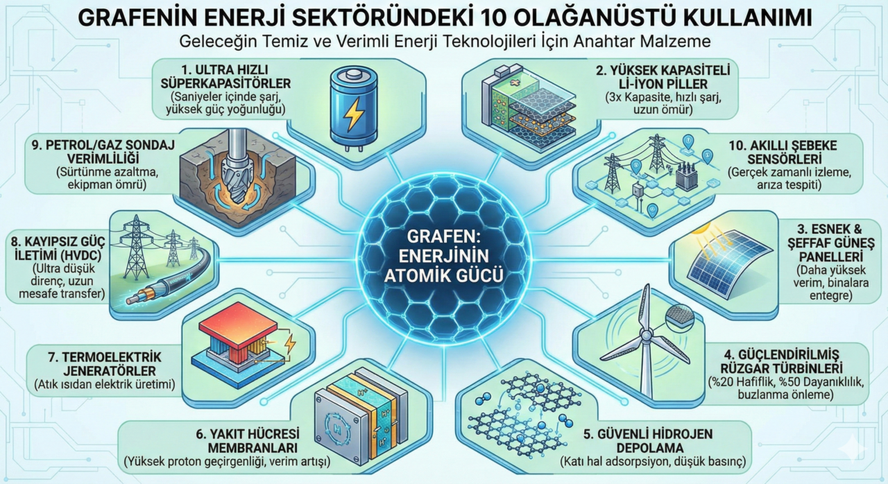 Dünya daha fazla enerjiye, ancak daha az karbon emisyonuna ihtiyaç duyuyor. Bu paradoksu çözmek için mevcut malzemeler yeterli değil. Elektriği bakırdan daha iyi ileten, çelikten 200 kat daha güçlü ve %97 ışık geçirgenliğine sahip grafen; enerji denklemini baştan yazıyor. İşte grafenin laboratuvarlardan çıkıp enerji santrallerine girdiği 10 kritik alan:
