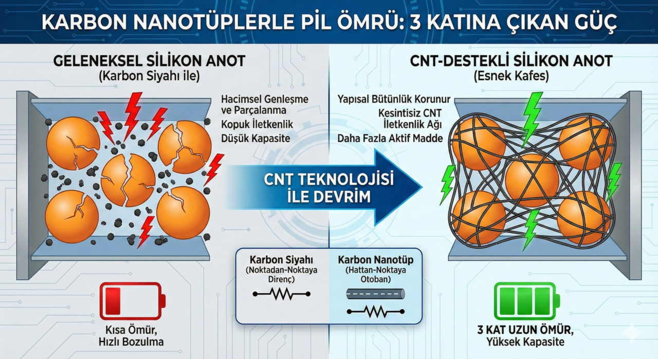 Öyleyse neden tüm piller silikondan yapılmıyor? Çünkü silikon, şarj sırasında %300 oranında şişer ve parçalanır. Pil birkaç döngüde ölür. İşte bu “mekanik intiharı” durdurabilecek tek malzeme Karbon Nanotüplerdir.