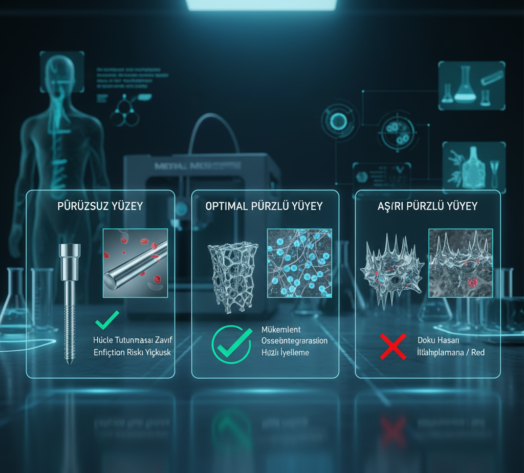 • 3D Baskı (Additive Manufacturing): Özellikle metal 3D baskı, implantın yüzey ve iç yapısında mikro ve makro gözenekli yapılar oluşturarak optimal pürüzlülüğü hassas bir şekilde kontrol etme imkanı sunar.