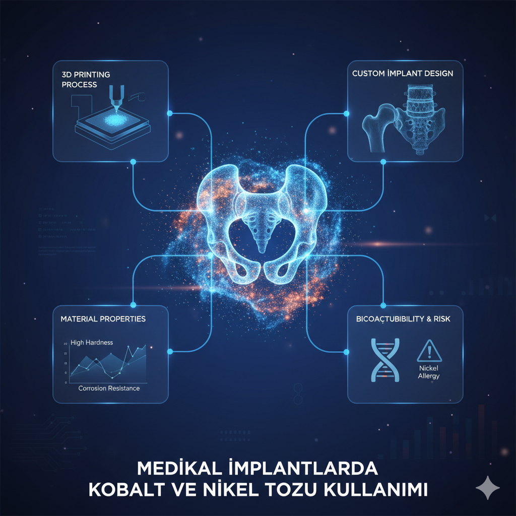 Modern tıp, vücudumuzun bozulan parçalarını onarmak için metalurjinin sınırlarını zorluyor. Kalça protezlerinden diş implantlarına, kalp kapakçıklarından omurga vidalarına kadar pek çok medikal cihazda Kobalt (Co) ve Nikel (Ni) tozları kritik roller üstleniyor. Özellikle 3D baskı (eklemeli üretim) teknolojilerinin gelişmesiyle, bu tozlar hastaya özel tasarımların “mürekkebi” haline geldi.