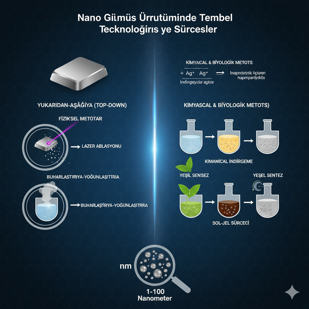 Nano gümüşün antimikrobiyal özelliklerinden sıkça bahsediyoruz, peki ama bu mikroskobik mucizeler nasıl yaratılıyor? Gümüş atomlarını alıp, onları hassas bir şekilde istenen boyut ve şekilde nanopartiküllere dönüştürme süreci, ileri teknoloji ve hassas kimyanın birleştiği büyüleyici bir alandır. Bu süreç, tek bir “sihirli formül”den ibaret değildir; amaca, maliyete ve saflık gereksinimlerine göre seçilen farklı teknolojileri içerir.