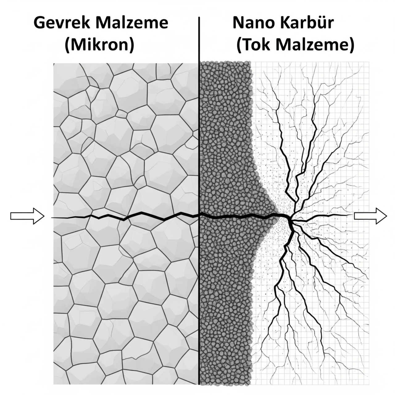 Geleneksel malzemelerde, sertliği artırmak genellikle atomik yapıyı daha rijit hale getirmeyi gerektirir, bu da çatlakların kolayca ilerlemesine neden olarak tokluğu düşürür. İşte nano karbürler bu denklemi değiştiriyor.