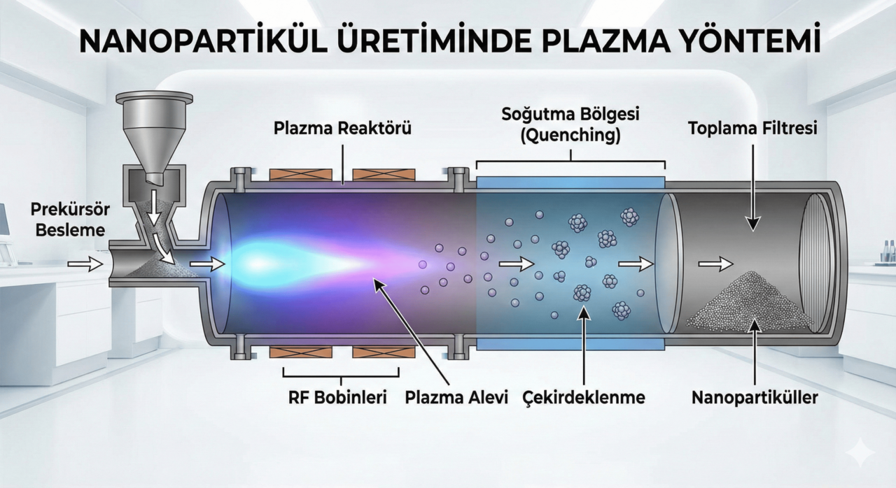 Nanopartikül üretiminde genellikle “ıslak kimya” (sol-jel, çöktürme) yöntemleri bilinir. Ancak bu yöntemler çok miktarda su ve kimyasal atık üretir. Geleceğin üretim teknolojisi olarak görülen Plazma Sentezi, gaz fazında gerçekleşen, atıksız, tek adımda ve saniyeler içinde sonuç veren bir süreçtir. Metal, seramik veya kompozit fark etmeksizin, erimesi en zor malzemeleri bile nano boyuta indirgeyebilen bu teknolojiyi derinlemesine inceliyoruz.