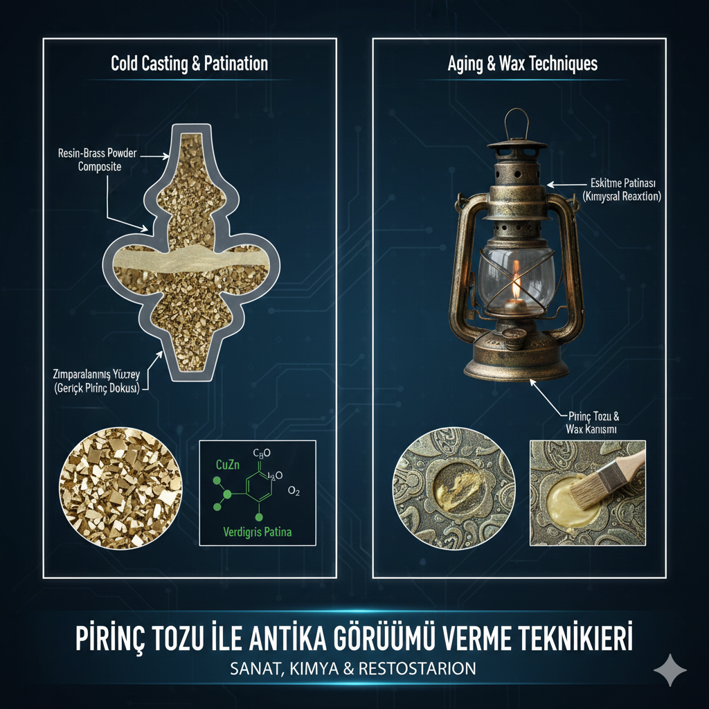 Pirinç tozu kullanarak antika görünümü verme tekniği, kimya ile sanatın mükemmel bir evliliğidir. Doğru mikron boyutundaki tozu seçmek, patinasyon sürecini bilimsel yöntemlerle yönetmek ve iş güvenliği kurallarına uymak, projenizin başarısını belirleyen temel unsurlardır. Günümüzde restorasyon biliminin sunduğu yeniliklerle, artık sadece “eski görünen” değil, aynı zamanda gelecek nesillere kalacak kadar dayanıklı sanat eserleri yaratmak mümkündür.