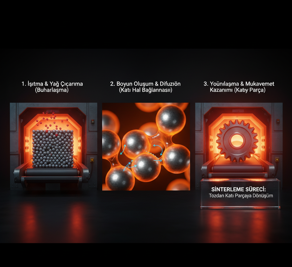 Sinterleme, sadece bir ısıtma işleminden çok daha fazlasıdır; toz halindeki bir malzemenin potansiyelini ortaya çıkaran, atomların kontrollü bir dansıdır. Bu süreç sayesinde, preslenmiş toz parçacıkları arasındaki zayıf mekanik temaslar, güçlü metalurjik bağlara dönüşür. Gözenekler kapanır, yoğunluk artar ve sonuç olarak, otomobillerde kullanılan bir dişliden, tıbbi bir implantta kullanılan karmaşık bir parçaya kadar her şeyin temelini oluşturan sağlam, güvenilir ve yüksek performanslı bir mühendislik malzemesi doğar.