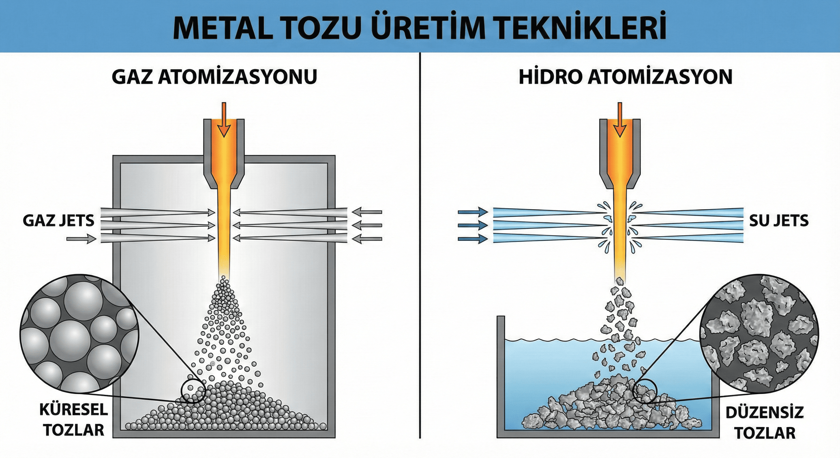 Eklemeli imalat (3D yazıcılar), Metal Enjeksiyon Kalıplama (MIM) ve geleneksel Toz Metalurjisi (PM) endüstrilerinin kalbinde tek bir hammadde yatar: Metal Tozu. Ancak, her metal tozu aynı değildir. Tozun şekli, boyutu ve kimyasal saflığı, nihai parçanın kalitesini doğrudan belirler. Bu özelliklerin belirlendiği aşama ise “Atomizasyon” sürecidir. Bugün, endüstride en sık kullanılan iki yöntemi, Gaz Atomizasyonu ve Su (Hidro) Atomizasyonu tekniklerini masaya yatırıyoruz. Hangi yöntem, hangi uygulama için daha uygun? Aralarındaki kritik farklar neler? Atomizasyon Nedir? En