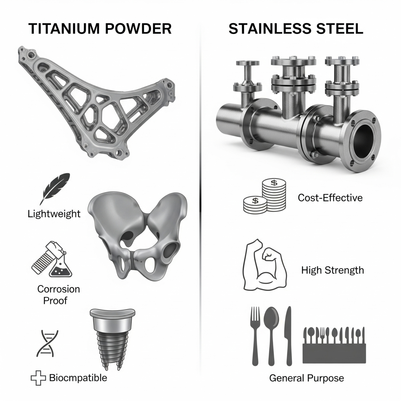 Paslanmaz çelik, güvenilirlik, yeterli performans ve düşük maliyeti bir araya getiren çok yönlü bir çözümdür. Titanyum tozu ise, ağırlık, korozyon ve biyouyumluluk gibi alanlarda taviz verilemeyeceği zaman başvurulan, yüksek performanslı bir uzman malzemedir.
