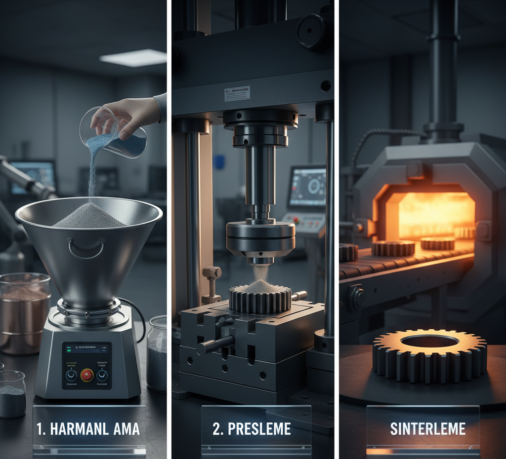 Toz Metalurjisi (P/M), metal tozlarını kullanarak karmaşık şekilli, net veya nete yakın şekilli (net-shape) parçalar üretmek için kullanılan son derece verimli ve gelişmiş bir imalat yöntemidir. Otomotivden beyaz eşyaya, havacılıktan medikal cihazlara kadar geniş bir alanda kullanılan bu teknoloji, özellikle yüksek adetli üretimlerde malzeme israfını minimize etmesi ve enerji verimliliği sunmasıyla öne çıkar. Peki, bir yığın metal tozu, hassas bir mühendislik bileşenine nasıl dönüşür? Bu sihirli dönüşüm, temel olarak üç ana adımda gerçekleşir: Harmanlama, Presleme ve Sinterleme.