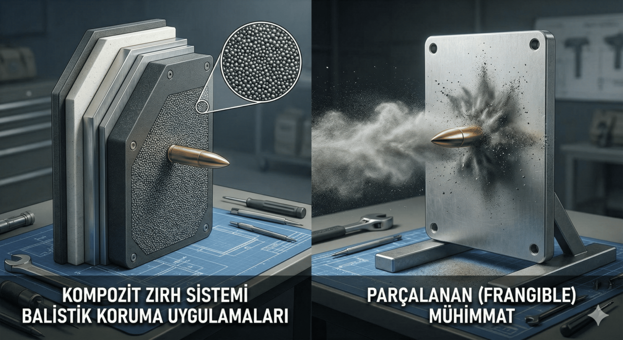 • Parçalanan (Frangible) Mermiler: Bu mühimmatlar, sert bir yüzeye çarptığında toz haline dönüşür. Bu bir “koruma” uygulamasıdır çünkü: