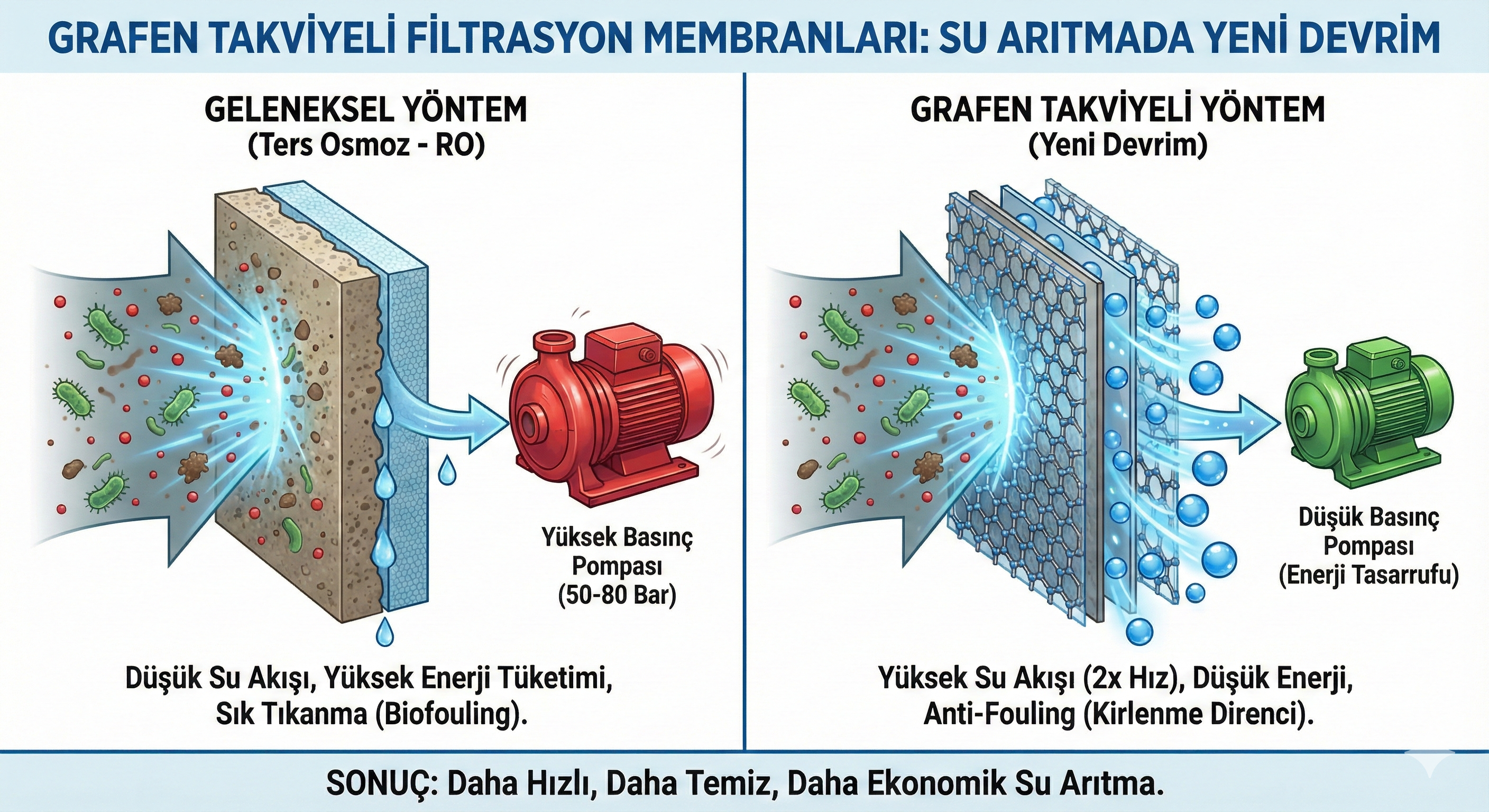 Dünyadaki tuzdan arındırma (desalinasyon) tesislerinin çoğu poliamid bazlı Ters Osmoz (RO) membranları kullanır. Bu teknoloji etkilidir ancak pahalıdır; suyu membrandan geçirmek için çok yüksek basınç (50-80 bar) gerekir. Ayrıca membranlar sık sık bakterilerle kaplanır (biofouling) ve tıkanır. Grafen, bu denklemi değiştiriyor. Grafen takviyeli membranlar, geleneksel polimerlere göre %50-%100 daha yüksek su akışı sağlarken, enerji tüketimini dramatik şekilde düşürüyor. Peki, su molekülleri grafenden nasıl geçerken diğer her şey geride kalıyor? 1. Nanofluidics (Nano-Akışkanlar) ve “Kayma Akışı”