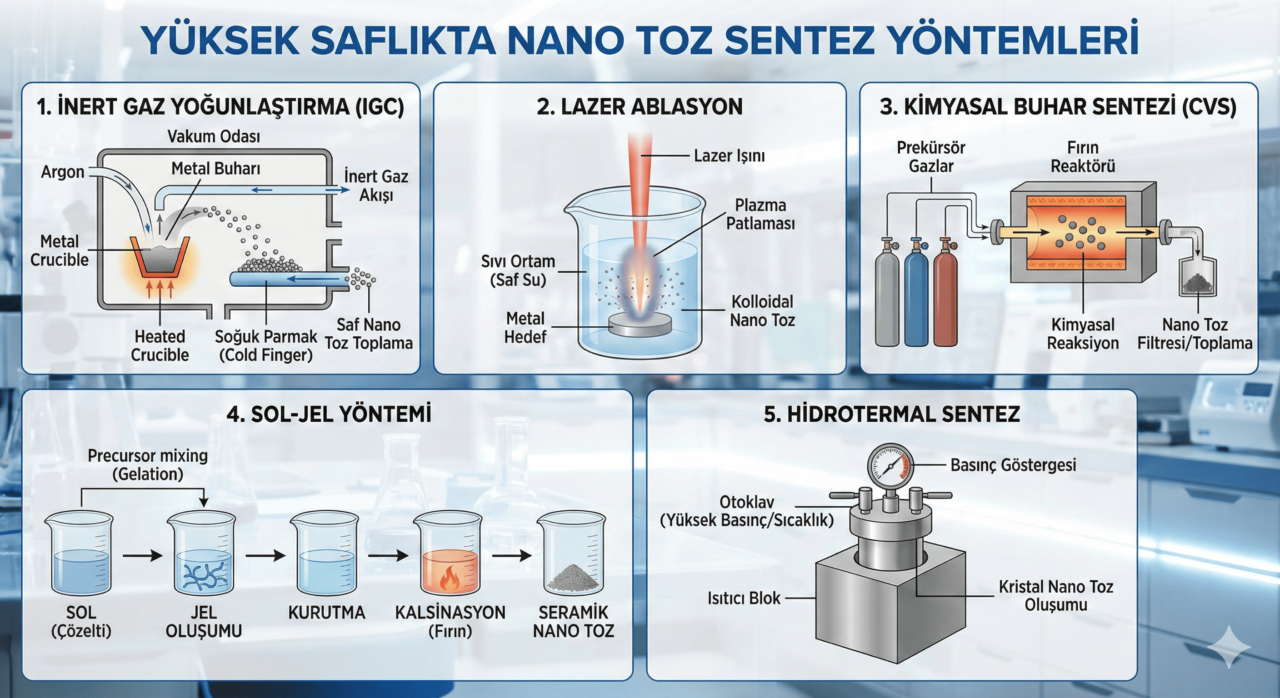 Nano toz üretmek kolaydır; ancak “saf” nano toz üretmek bir mühendislik sanatıdır. Saflık, bir malzemenin içinde istenmeyen yabancı atomların bulunmaması demektir. Elektronik bir çipte kullanılan bakır nano tozunun içindeki milyonda bir oranındaki (ppm) oksijen veya karbon kirliliği, cihazın kısa devre yapmasına neden olabilir. Bu nedenle yüksek saflıkta nano toz sentez yöntemleri, malzemeyi sadece küçültmeye değil, onu moleküler düzeyde kusursuz inşa etmeye odaklanır. Bu yazımızda, Gaz Fazı Yoğunlaştırma, Lazer Ablasyon ve Sol-Jel gibi en temiz üretim tekniklerini ve çalışma prensiplerini detaylandırıyoruz.