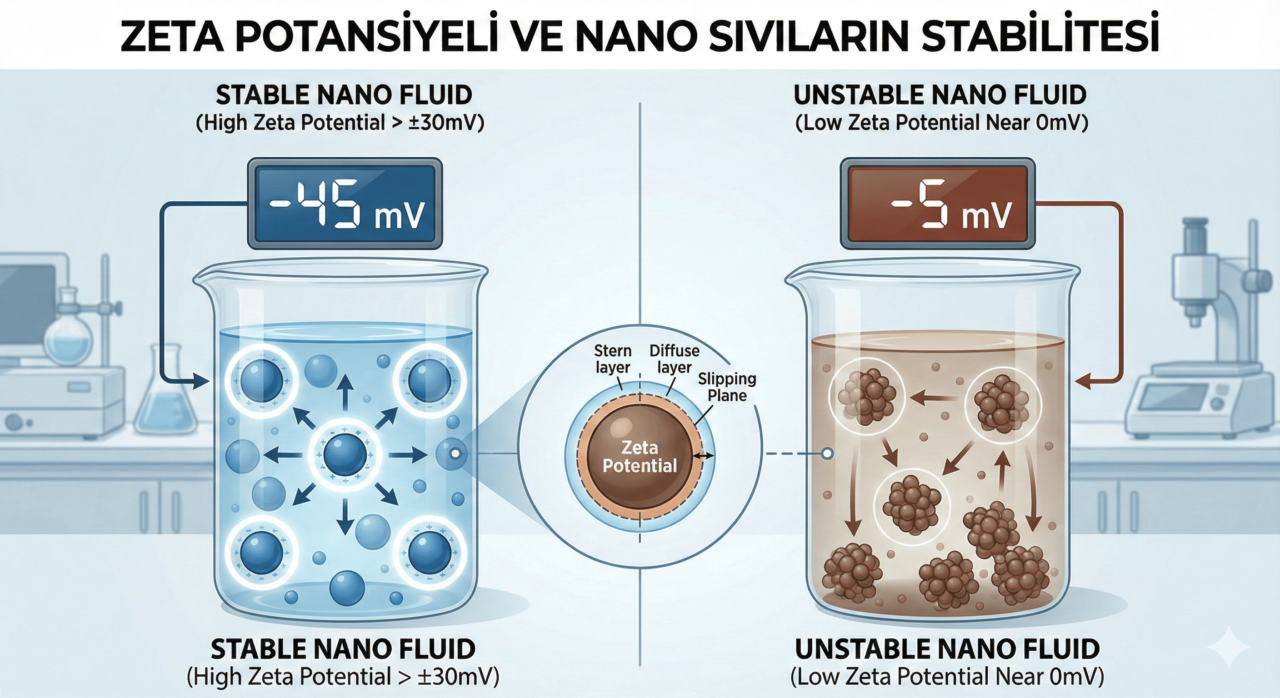 Nano sıvıların stabilitesi (kararlılığı), parçacıkların birbirini ne kadar güçlü ittiğine bağlıdır. Eğer itme kuvveti zayıfsa, parçacıklar çarpışır, yapışır (aglomerasyon) ve büyüyerek çöker.